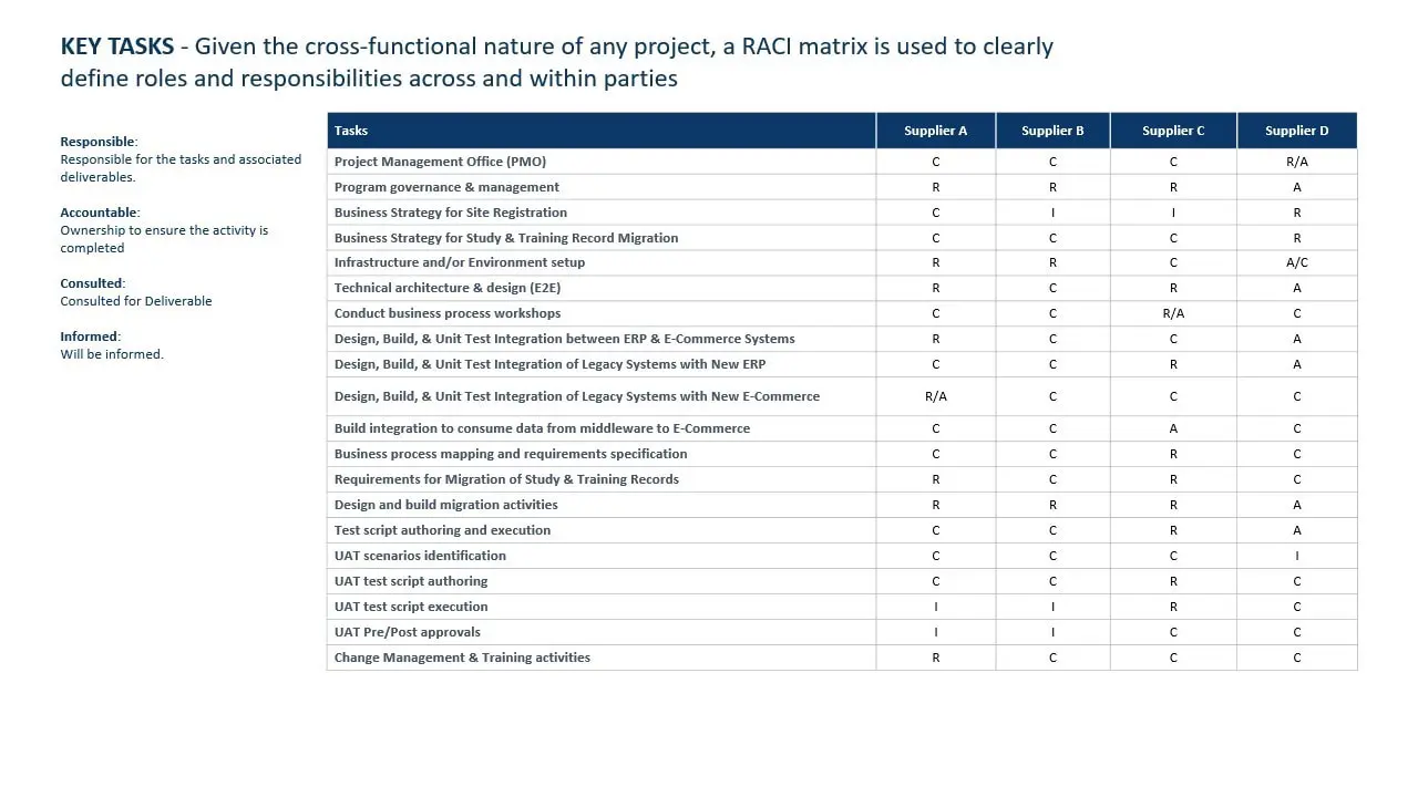 From a tactical perspective, it’s important that the same RACI matrix is included within each supplier’s contract so that everyone is operating from the same table, terms, and conditions. This often takes some negotiation but with the proper foundation and alignment, you shouldn’t have any pushback from your suppliers. In fact, if you do have a supplier that is heavily pushing back against this exercise we recommend our clients view this as a potential leading indicator for what’s to come with that particular relationship.